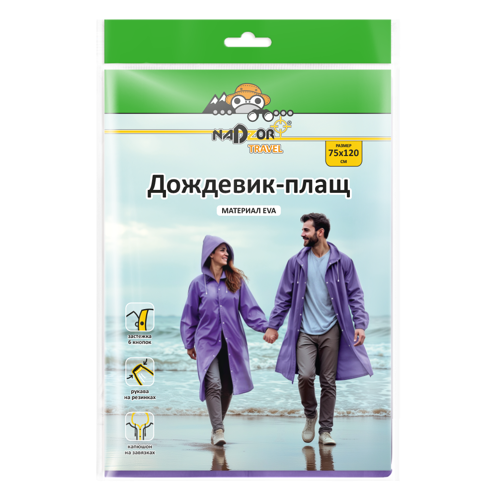 Дождевик-плащ EVA, фиолетовый, на кнопках, рукава на резинках, 110 мк