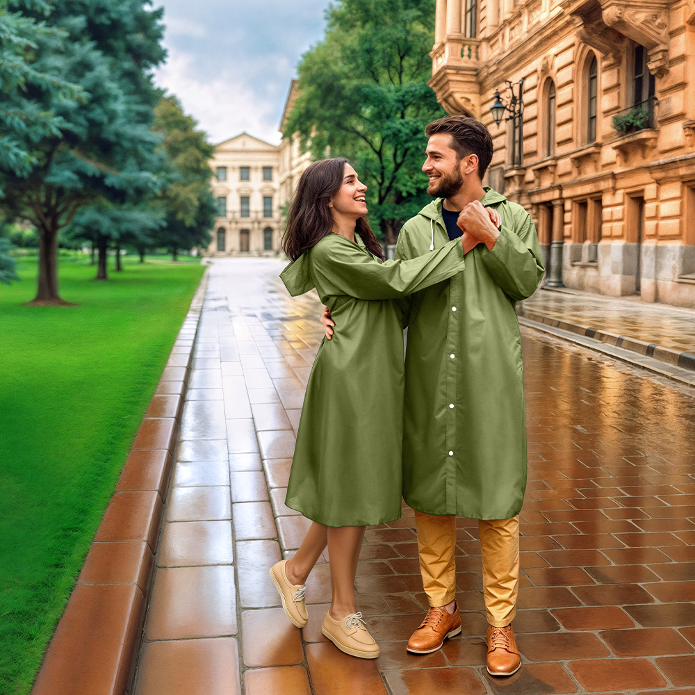 Зеленый дождевик - плащ – ваш надежный помощник в дождливую погоду. Имеет капюшон на завязках, который защитит от дождя и ветра. Дождевик застегивается на 6 кнопок, что гарантирует удобство и комфорт. Плотный материал позволит прослужить дождевику несколько сезонов. Классический зеленый цвет – это универсальный вариант для любой ситуации. Идеально подходит для отдыха на природе, пикников и городских прогулок.