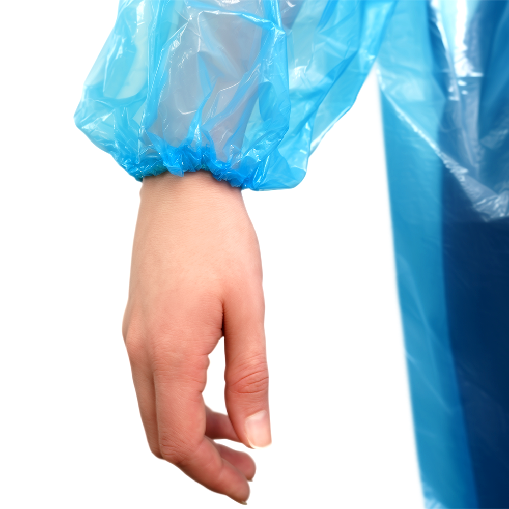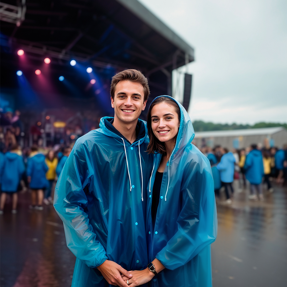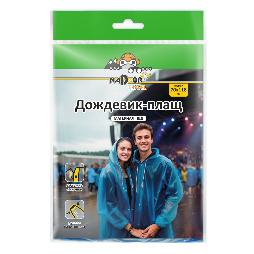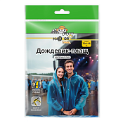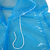 Дождевик голубого цвета из полиэтилена на кнопках. Дополнительной защитой служат завязки на капюшоне и резинки на рукавах.