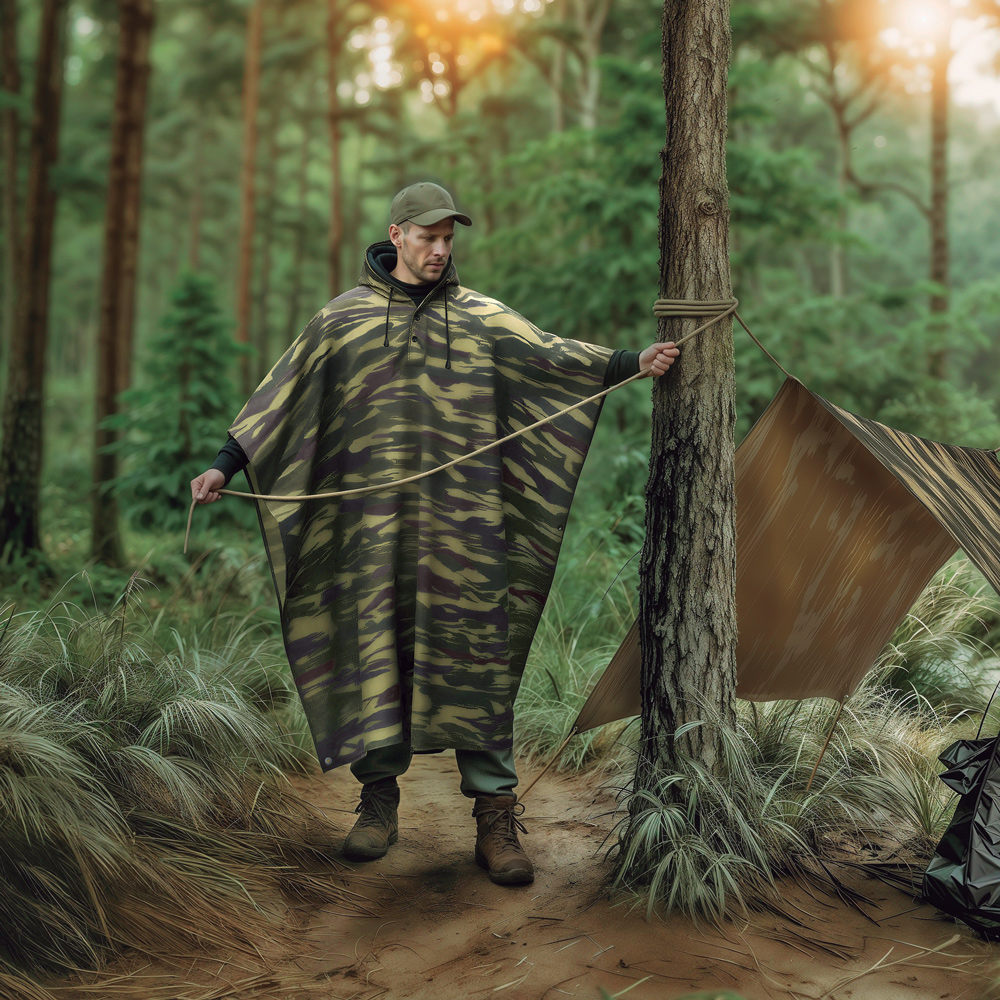 Пончо - это многофункциональное использование: дождевик, подстилка, тент, палатка. А наличие люверсов по краям упрощает его использование.