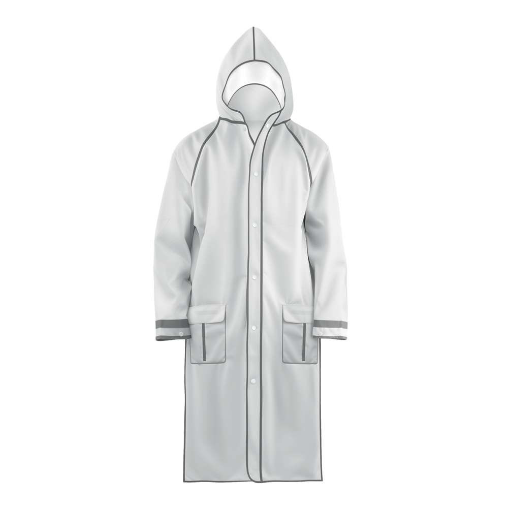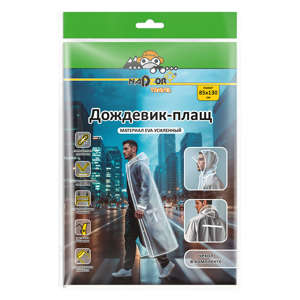 Прочный дождевик-плащ EVA, белый со светоотражающими кантом и полосами, на кнопках, прозрачный капюшон, с карманами, 130 мк, Nadzor