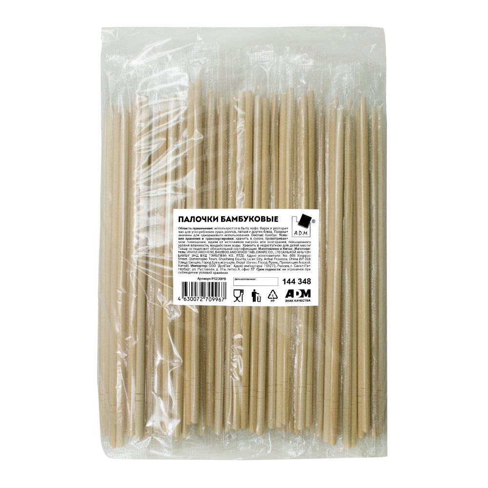 Палочки для еды бамбуковые, 23 см, в полипропиленовой упаковке 100 шт/уп., А.Д.М.