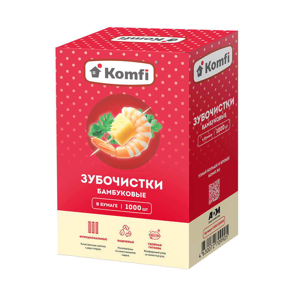 Зубочистки бамбуковые в инд.бумажной упаковке 1000 шт, в коробке, Komfi