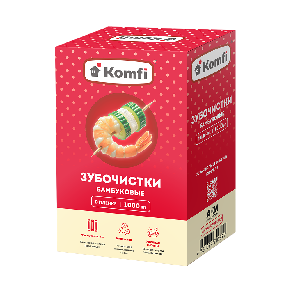 Зубочистки бамбуковые в инд. полипропиленовой упаковке 1000 шт, в коробке, Komfi