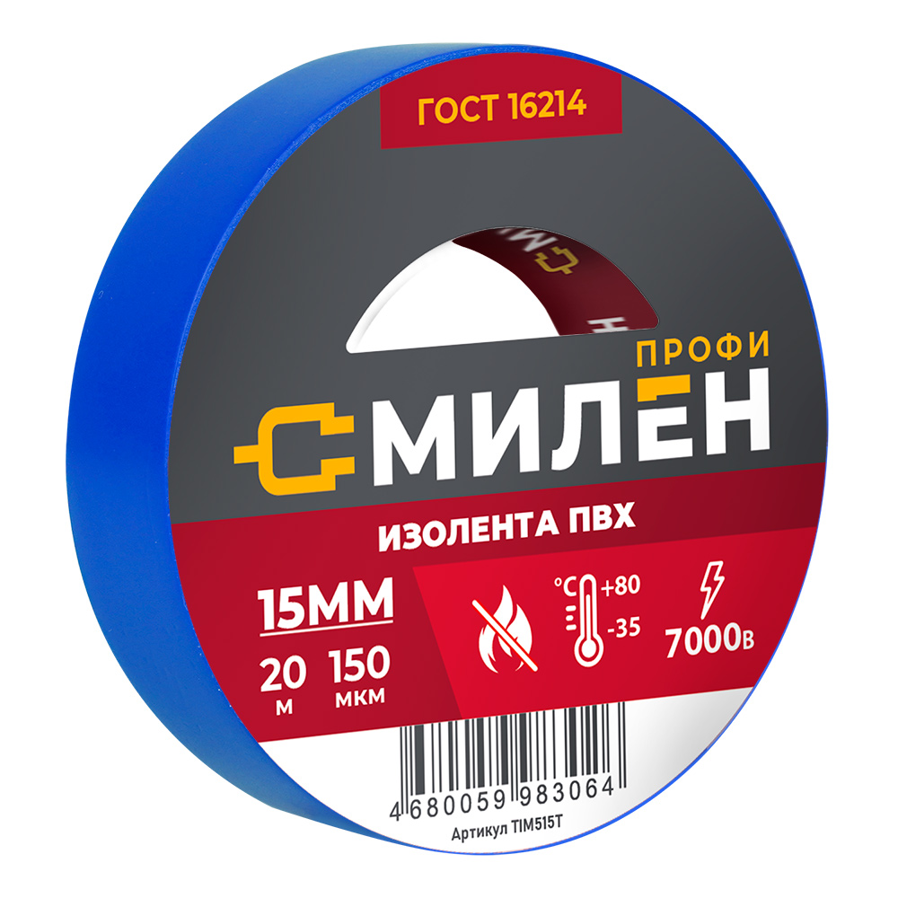 Изолента, ПВХ, 15мм * 20м, 150 мкм, 7кВ, синяя, Милен