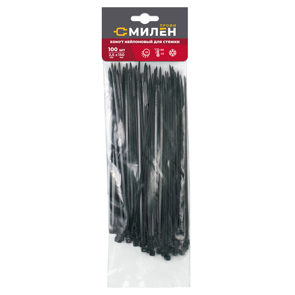 Нейлоновые хомуты для стяжки Милен, чёрные, 2,5*150 мм, 100 шт