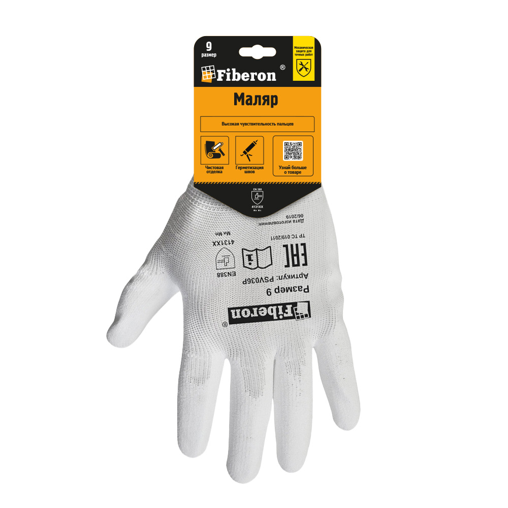Перчатки "МАЛЯР: точные работы", полиэстер, полиуретановое покрытие, в и/у, 9(L), белые, Fiberon