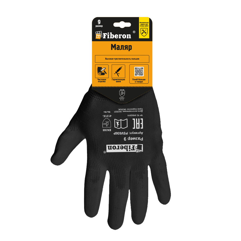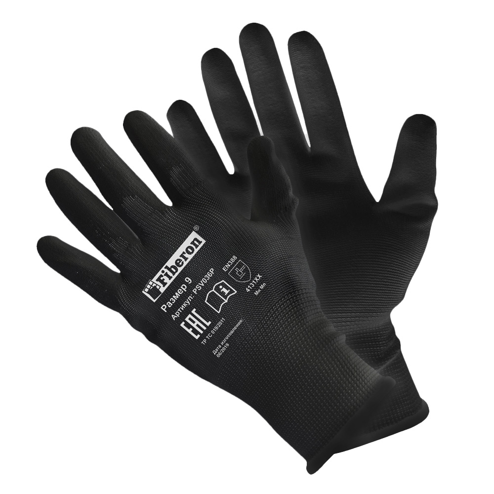 Перчатки "МАЛЯР: точные работы", полиэстер, полиуретановое покрытие, в и/у, 9(L), черные, Fiberon