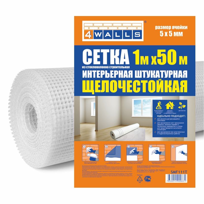 Сетка интерьерная штукатурная, стекловолокно, 1*50 м, ячейка 5*5, белая, 4Walls
