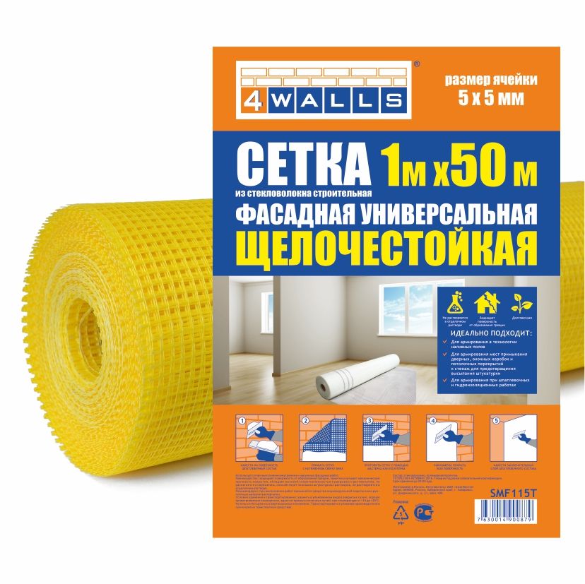 Сетка универсальная фасадная, стекловолокно, 1*50 м, ячейка 5*5, желтая, 4Walls