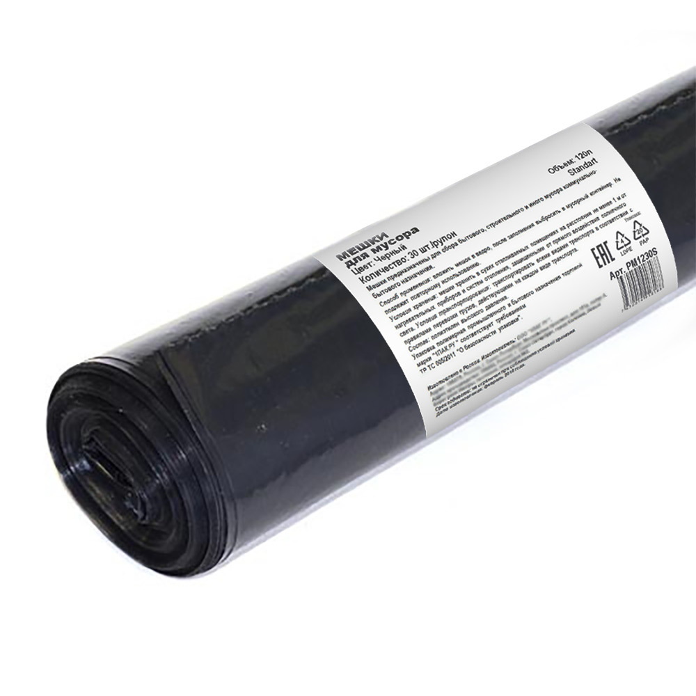 Мешки для мусора ПВД, 60 мкм, 120л, чёрные, в рулоне, 30 шт/уп.