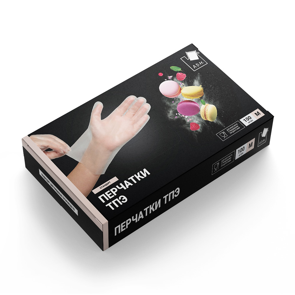 Перчатки ТПЭ А.Д.М. очень эластичные. Для удобства использования, со всех сторон потяните манжету вниз, чтобы зафиксировать её на руке. Подходят для контакта с пищевыми продуктами.
